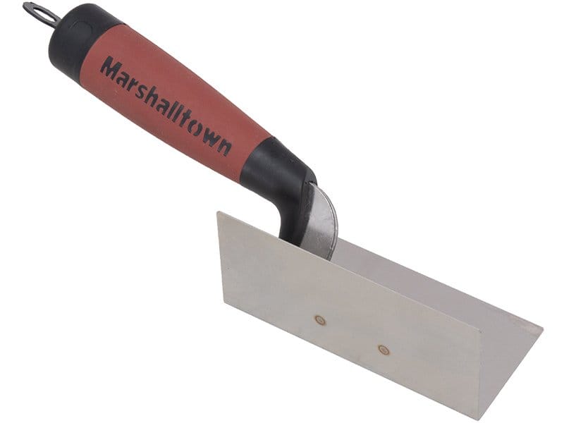 Marshalltown Inneneck-Kelle: Langes Edelstahlblatt, 90-Grad-Biegung. Ein Stück gefertigt, belastbarer Durasoft-Griff für Komfort. Perfekt für präzise 90 Grad Winkel. Maße: 108×25 mm.