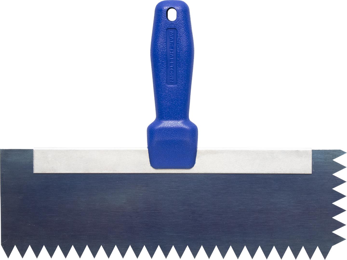 Marshalltown Kratzkelle mit V-förmigen Kerben für erste Putzschicht aus Blaustahl. Kunststoffgriff. Maße: 305×127 mm.