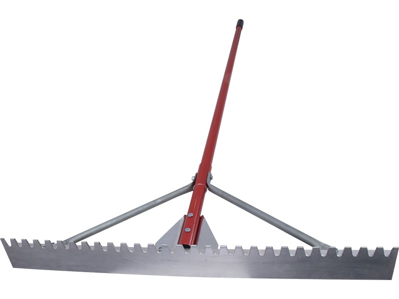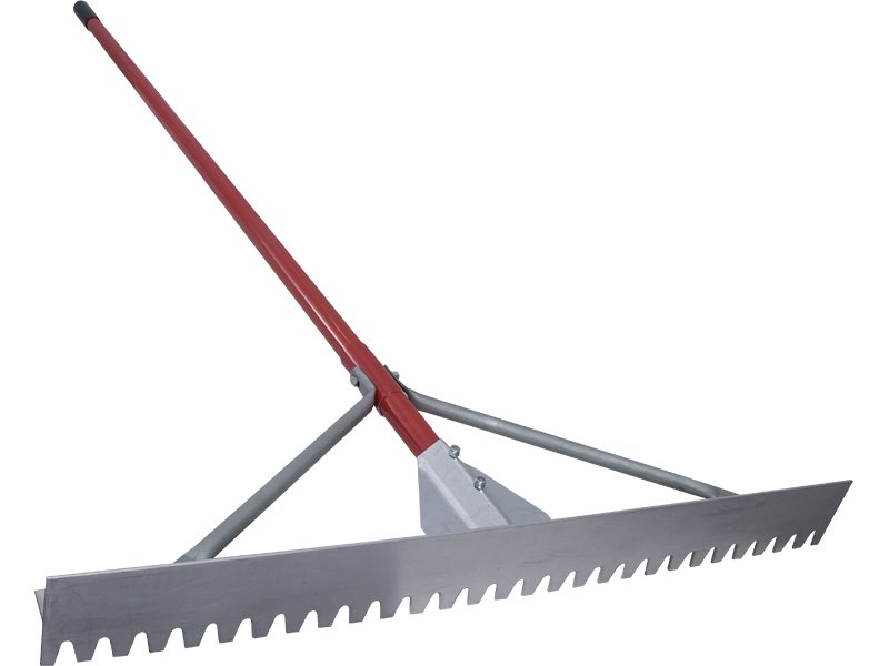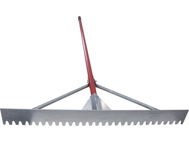 Marshalltown Betonverteiler: Langlebiges Magnesiumblatt mit stumpfen Zähnen für reibungsloses Materialpassieren. Verstärkter Aluminiumstiel 2134 mm. Maße: 914×76 mm.