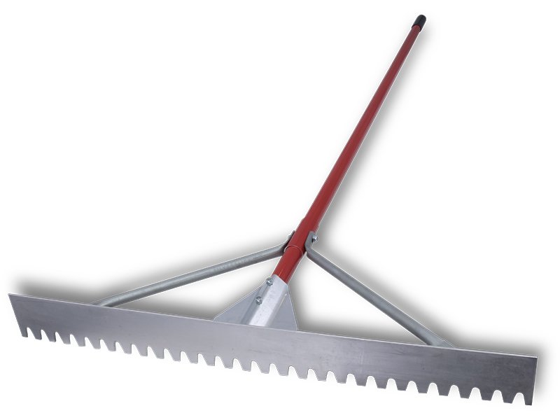 Marshalltown Betonverteiler: Langlebiges Magnesiumblatt mit stumpfen Zähnen für reibungsloses Materialpassieren. Verstärkter Aluminiumstiel 2438 mm. Maße: 813×76 mm.
