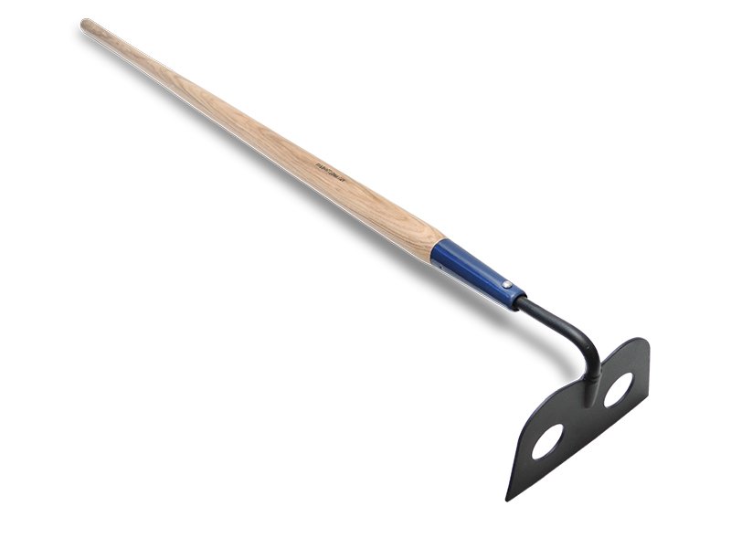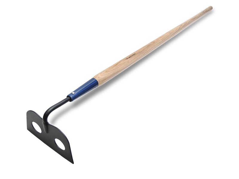 Mörtelhacke aus geschmiedetem Carbonstahlblatt und Hartholzstiel (1676 mm) ist ideal zum Mischen von Mörtel. Effektive Mischung dank Löchern im Blatt. Maße: 152×254 mm.