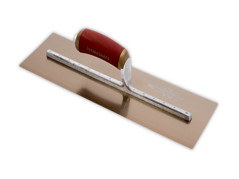 Marshalltown PermaShape Glättkelle: Hochwertiger Goldstahl, konisch geschliffene Kanten, wärmebehandelte Aluminiumlegierung, leicht und stark, gehärtete Stahlnieten, patentierter Durasoftgriff. Maße: 305×127 mm.