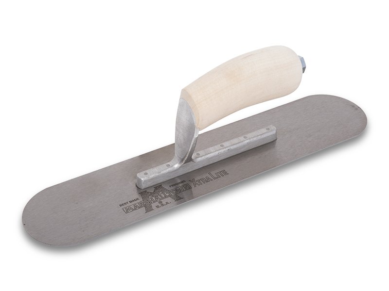 Die vollabgerundete Glättkelle von Marshalltown ist hergestellt aus robustem Stahl, die durch Hartverchromung Gipsbrand reduziert. Sie wird zum Nivellieren, Verteilen und Veredeln von Wände und Böden verwendet. Das Stahlblatt ist mit 6 sichtbaren Nieten fest mit der Aluminiumgusshalterung verbunden, die einen Vierkant Schaft hat, damit sich die Kelle nicht dreht. Diese Glättkelle von Marshalltown hat den Vorteil, dass man keine Furchen oder Rillen auf der zu bearbeitenden Oberfläche hinterlässt, da die Enden abgerundet sind. Der gebogene Holzgriff ist sicher an die Halterung/Stütze angebracht, er ist sehr pflegeleicht und liegt gut in der Hand, das ermöglicht dem Handwerker den ganzen Tag zu arbeiten, ohne das seine Hände schmerzen. Er ist ganz einfach auswechselbar durch einen Durasoft Griff, DuraKork Griff oder einen anderen Holzgriff.
