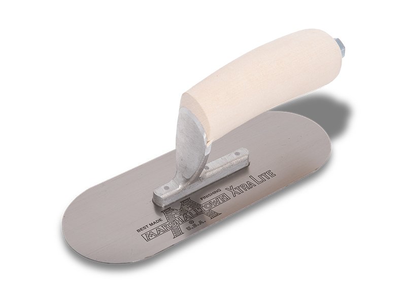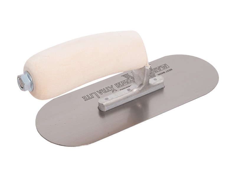 Die vollabgerundete Glättkelle von Marshalltown ist hergestellt aus robustem Carbonstahl, somit hat man lange Freude an ihr. Sie wird zum Nivellieren, Verteilen und Veredeln von Wände und Böden verwendet. Das Blaustahlblatt ist mit 3 sichtbaren Nieten fest mit der Aluminiumgusshalterung verbunden, die einen Vierkant Schaft hat, damit sich die Kelle nicht dreht. Diese Glättkelle von Marshalltown hat den Vorteil, dass man keine Furchen oder Rillen auf der zu bearbeitenden Oberfläche hinterlässt, da die Enden abgerundet sind. Besonders hervorzuheben ist, dass die erste Niete am Blatt vorne deutlich dicker ist als die anderen, denn dort findet auch die meiste Belastung statt. Der gebogene Holzgriff ist sicher an die Halterung/Stütze angebracht, er ist sehr pflegeleicht und liegt gut in der Hand, das ermöglicht dem Handwerker den ganzen Tag zu arbeiten, ohne das seine Hände schmerzen. Er ist ganz einfach auswechselbar durch einen Durasoft Griff, DuraKork Griff oder einen anderen Holzgriff.