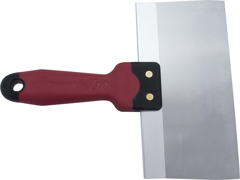 Marshalltown QLT Flächenspachtel: Hochwertiges, gehärtetes Edelstahlblatt mit Aluminium-Trägerplatte. Perfekt für Wandkitt, Trockenbaufugen und Oberflächenabschaben. Softgrip-Griff, konisches Blatt. Maße: 203×76 mm.