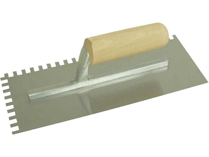 Marshalltown QLT gezahnte Kelle: Kontrollierte Klebstoffmenge beim Verlegen von Fliesen und Bodenbelägen. Haltbare Halterung, gehärtetes Stahlblatt, bequemer Holzgriff. 279×114 mm. Eckig 13x13x13 mm.