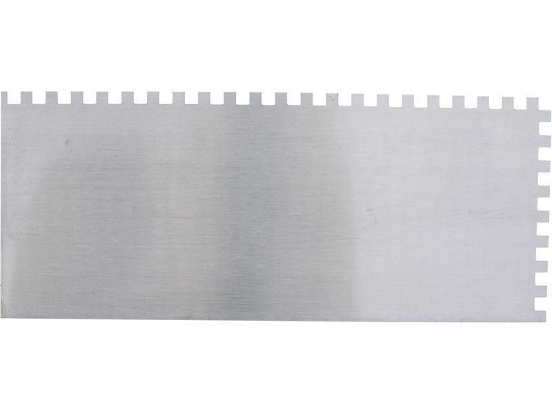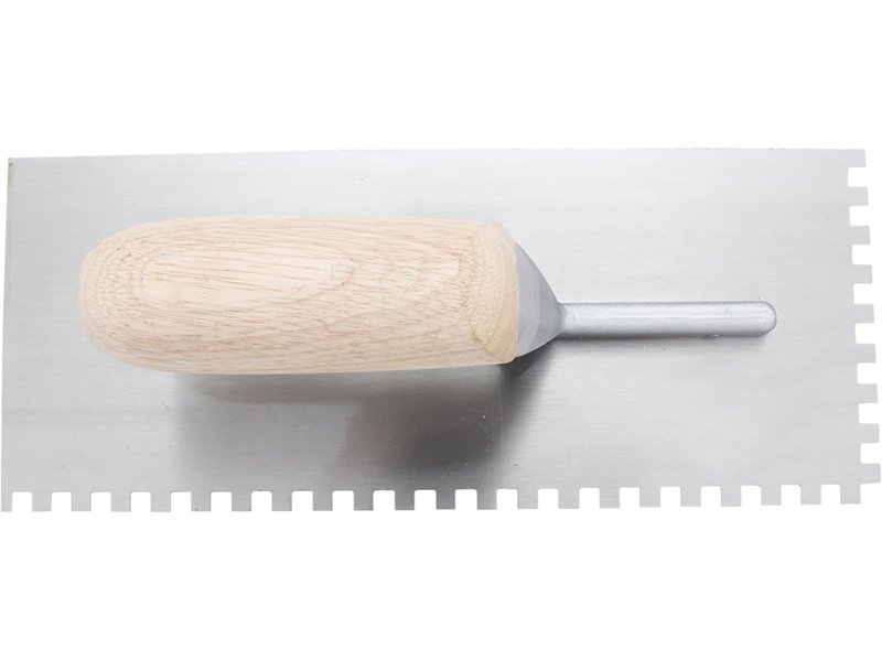 Die gezahnte Kelle von Marshalltown QLT wird zum Verlegen von Fliesen, Teppichen und anderen Bodenbelägen, die mit Klebstoff oder Fliesenkleber bestrichen werden, verwendet. Durch die Zahnung und Größe der Kerben kann man die Menge des aufgetragenen Klebstoffs kontrollieren. Die Halterung aus Aluminiumguss ist fest vernietet an einem Blatt aus gehärtetem Stahl. Der Holzgriff liegt gut in der Hand und bietet eine ausgezeichnete Haltbarkeit. Bei dieser Kelle sind zwei Seiten der Kelle gezahnt und zwei glatt und die Blattgrösse ist 279×114 mm.