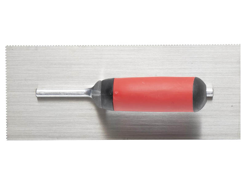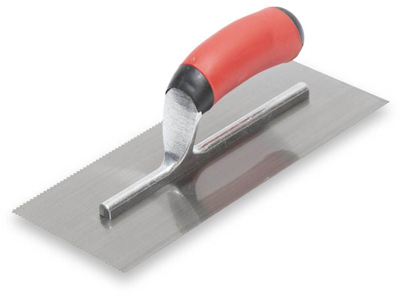 Marshalltown QLT gezahnte Kelle: Perfekt zum Verlegen von Fliesen und Bodenbelägen. Kontrolliert die Klebstoffmenge mit Zahnung und Kerbgröße. Aluminiumguss-Halterung, gehärtetes Stahlblatt. Softgrip-Griff. 279×114 mm Blattgröße. Flaches V-1,5×1,5×1,5 mm.