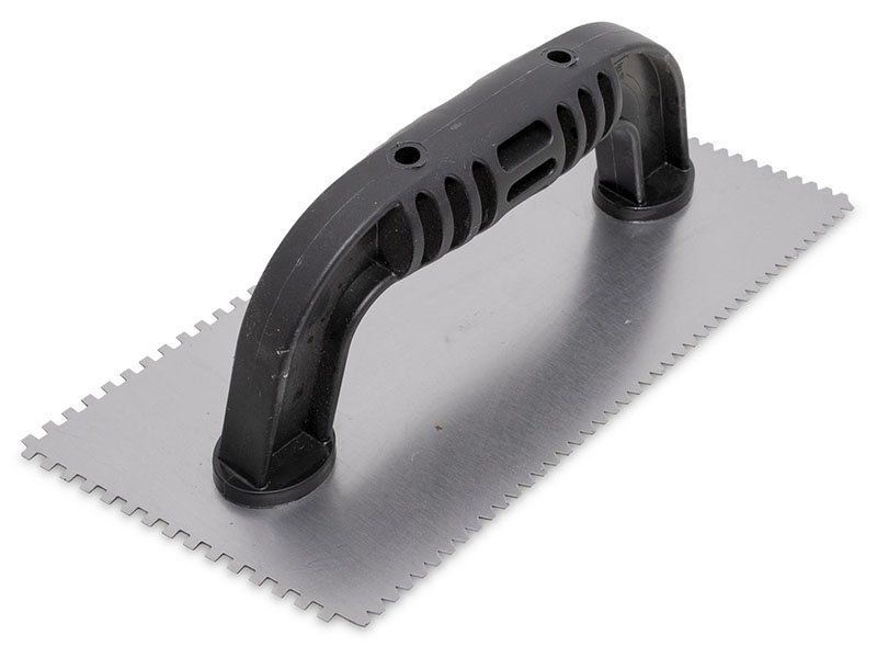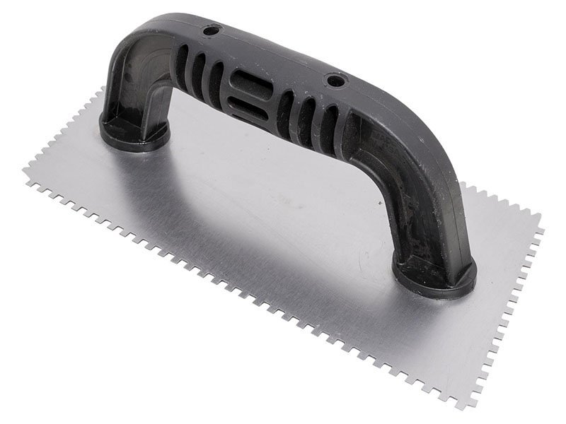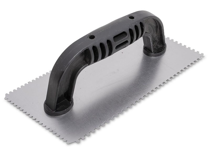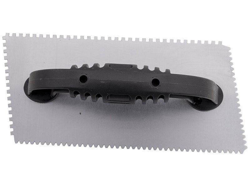 Marshalltown QLT Gezahnte Kelle, Flaches V 3x3x1,5 mm/ Eckig 3x3x3 mm, 10 Grad gekürzt, Kunststoffgriff, Stahl, Maße: 229×102 mm