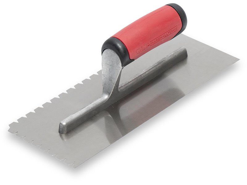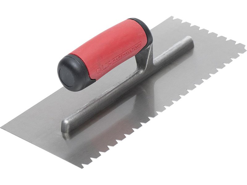Marshalltown QLT gezahnte Kelle zum Verlegen von Fliesen und Bodenbelägen. Kontrolliert die Klebstoffmenge mit Zahnung und Kerbgröße. Aluminiumguss-Halterung, gehärtetes Stahlblatt, Softgrip-Griff. Blattgröße: 279×114 mm. Flaches V-4,5x6x8 mm.
