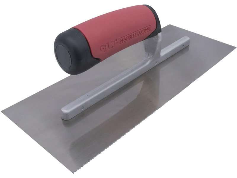 Marshalltown QLT gezahnte Kelle zum Verlegen von Fliesen und Bodenbelägen. Kontrolliert die Klebstoffmenge mit Zahnung und Kerbgröße. Aluminiumguss-Halterung, gehärtetes Stahlblatt, Softgrip-Griff. Blattgröße: 279×114 mm. U-1,5×0,75×0,75 mm.