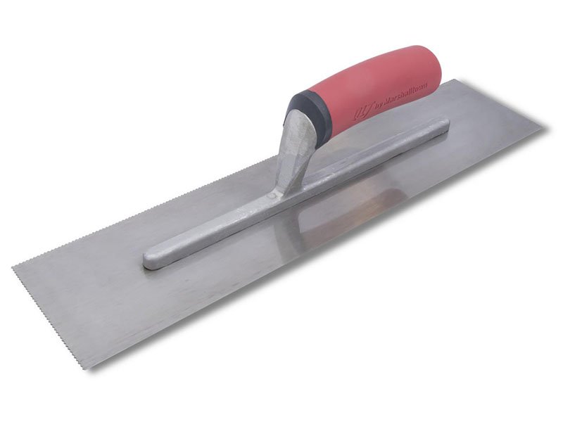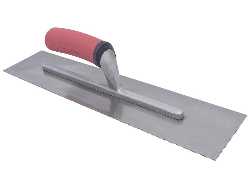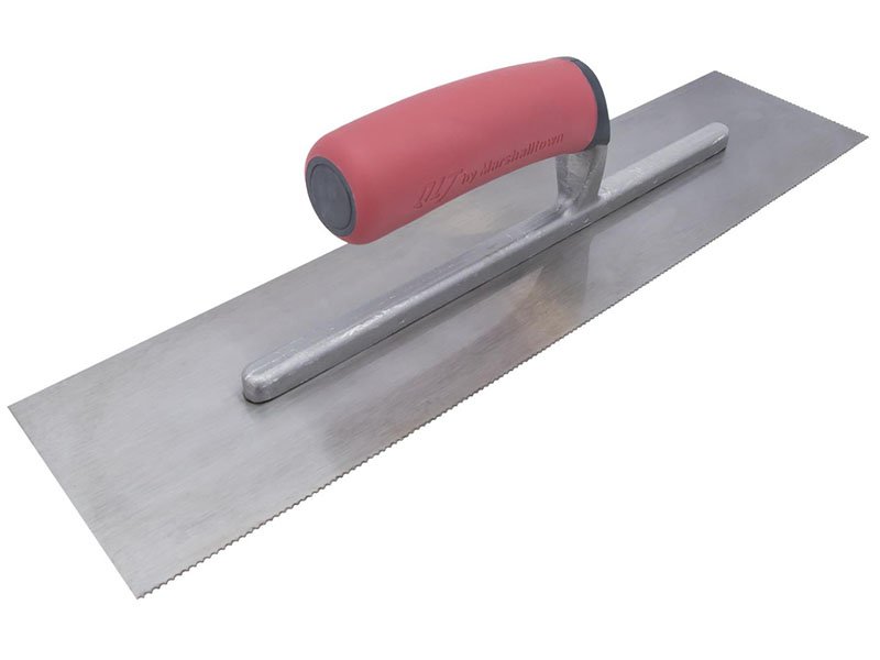 Marshalltown QLT gezahnte Kelle zum Verlegen von Fliesen und Bodenbelägen. Kontrolliert die Klebstoffmenge mit Zahnung und Kerbgröße. Aluminiumguss-Halterung, gehärtetes Stahlblatt, Softgrip-Griff. Blattgröße: 279×114 mm. U-1,5×0,75×1,5 mm.