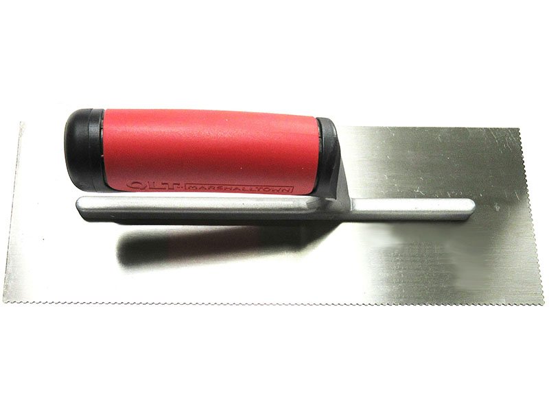 Marshalltown QLT gezahnte Kelle zum Verlegen von Fliesen und Bodenbelägen. Kontrolliert die Klebstoffmenge mit Zahnung und Kerbgröße. Aluminiumguss-Halterung, gehärtetes Stahlblatt, Softgrip-Griff. Blattgröße: 279×114 mm. U-1,5×0,75×1,5 mm.