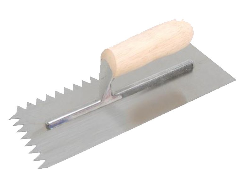 Die gezahnte Kelle von Marshalltown QLT wird zum Verlegen von Fliesen, Teppichen und anderen Bodenbelägen, die mit Klebstoff oder Fliesenkleber bestrichen werden, verwendet. Durch die Zahnung und Größe der Kerben kann man die Menge des aufgetragenen Klebstoffs kontrollieren. Die Halterung aus Aluminiumguss ist fest vernietet an einem Blatt aus gehärtetem Stahl. Der Holzgriff liegt gut in der Hand und bietet eine ausgezeichnete Haltbarkeit. Bei dieser Kelle sind zwei Seiten der Kelle gezahnt und zwei glatt und die Blattgrösse ist 279×114 mm.
