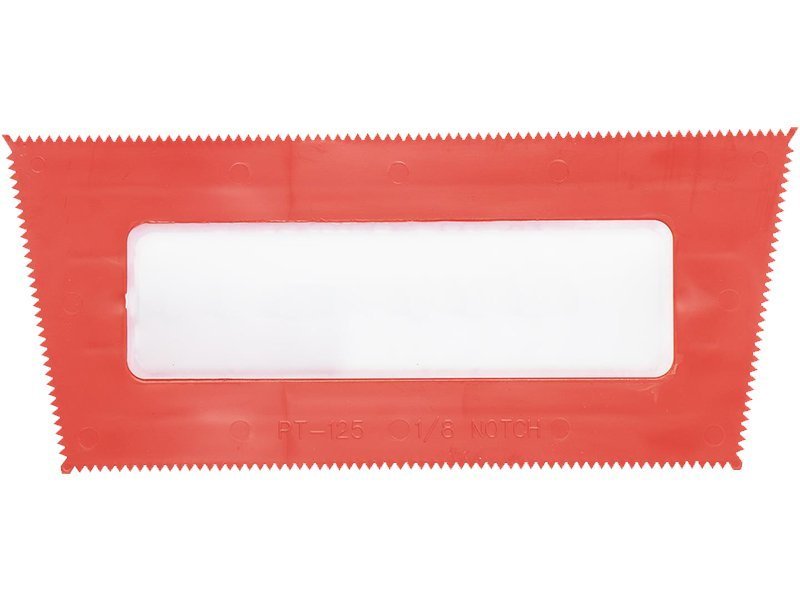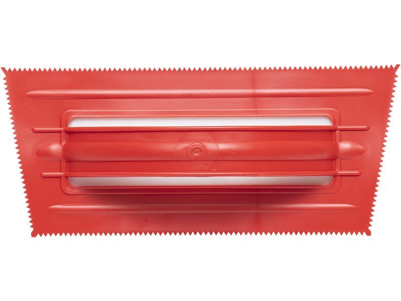 Robuste V-gezahnte Kelle aus Kunststoff, für Linkshänder und Rechtshänder geeignet. Ideal zum Verlegen von Fliesen und Teppichen mit präziser Klebstoffkontrolle. Maße: 241×108 mm, V-Zahnung: 3×3 mm.
