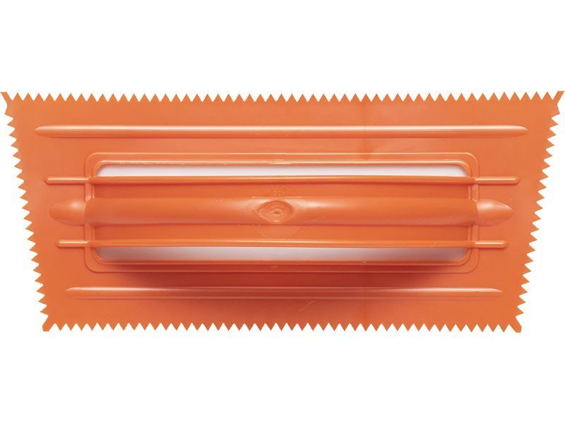 Robuste V-gezahnte Kelle aus Kunststoff, für Linkshänder und Rechtshänder geeignet. Ideal zum Verlegen von Fliesen und Teppichen mit präziser Klebstoffkontrolle. Maße: 241×108 mm, V-Zahnung: 4,5×4,5 mm.