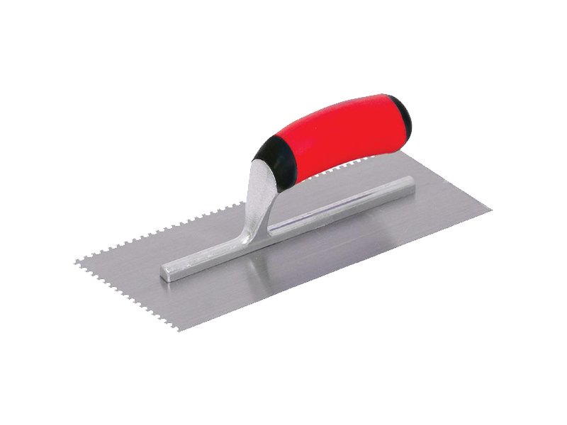 Marshalltown QLT Gezahnte und einseitig gekürzte Kelle, Eckig 3x3x3 mm, Soft Grip Griff, Stahl, Maße: 279×114 mm