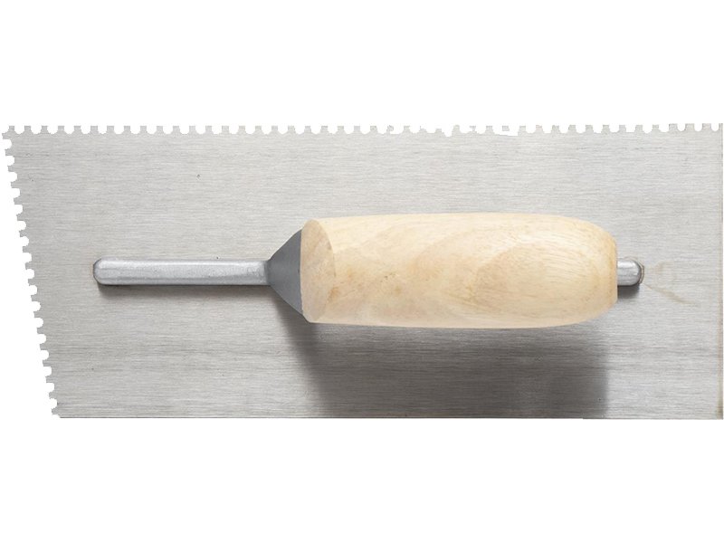 Die gezahnte Kelle von Marshalltown QLTlicht präzises Aufagen von Klebstoff für Fliesen und Bodenbeläge. Langlebiges Design mit Holzgriff. Blattgröße: 279×114 mm. U-3x3x3 mm.