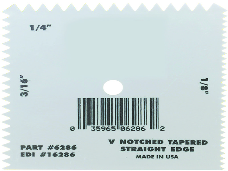 Marshalltown QLT gezahnter Spachtel aus robustem, rostfreiem Kunststoff mit V-Zahnung und 102×102 mm Maß. Langlebig und vielseitig einsetzbar. V 3×1,5;4,5×4;6×4,5mm/abgeschrägt.