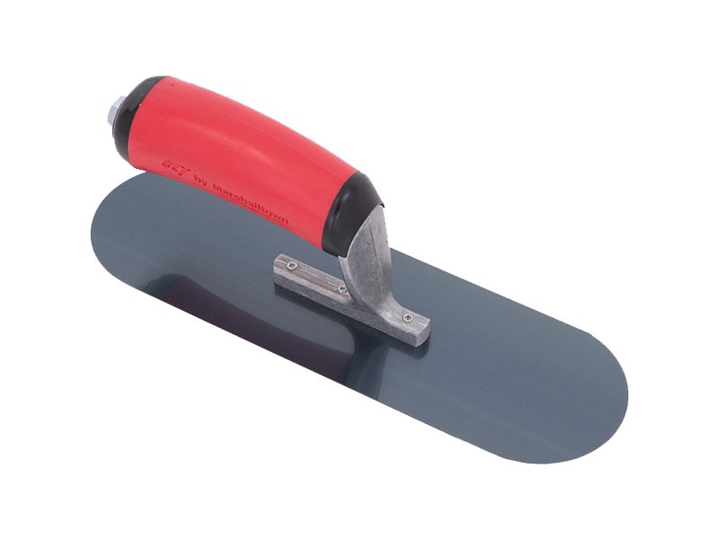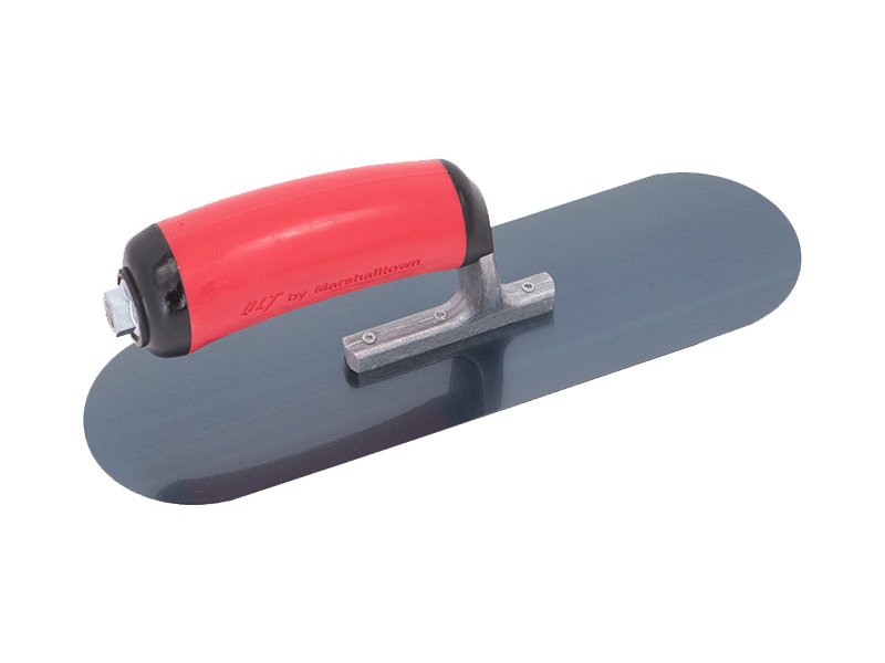 Die vollabgerundete Glättkelle von Marshalltown QLT: Robustes Blaustahlblatt, keine Furchen oder Rillen, sicherer Softgrip Griff. Maße: 254×76 mm. 3 sichtbare Nieten.
