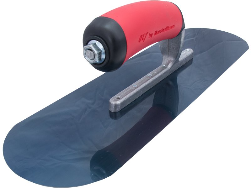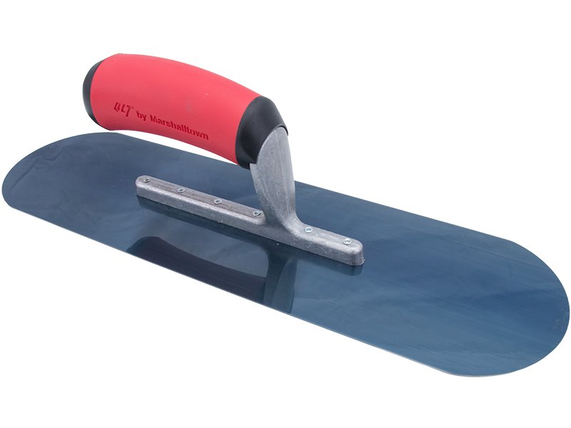Die vollabgerundete Glättkelle von Marshalltown QLT: Robustes Blaustahlblatt, keine Furchen oder Rillen, sicherer Softgrip Griff. Maße: 356×102 mm. 3 sichtbare Nieten.