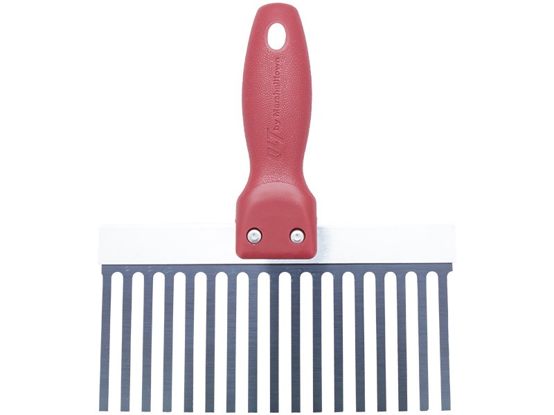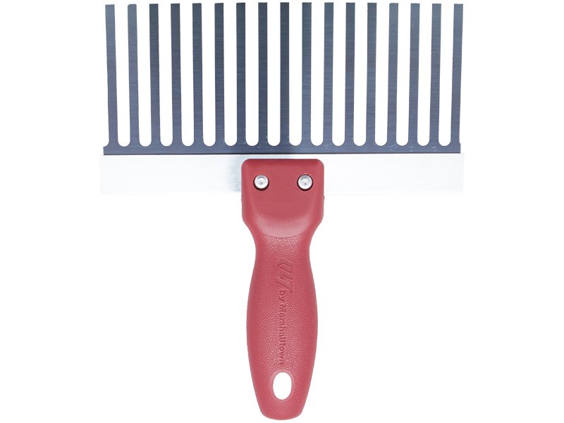 Stuck-/Putzkamm von Marshalltown QLT Leichter, rob Blaustahl, 6 mm breite Zinken für gute Verbindung mit Endbeschichtung. Softgrip Griff, korrosionsbeständige Aluminium-Trägerplatte, Aufhängeloch. Breite: 203 mm.