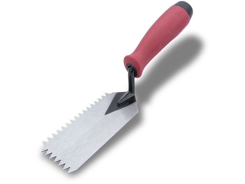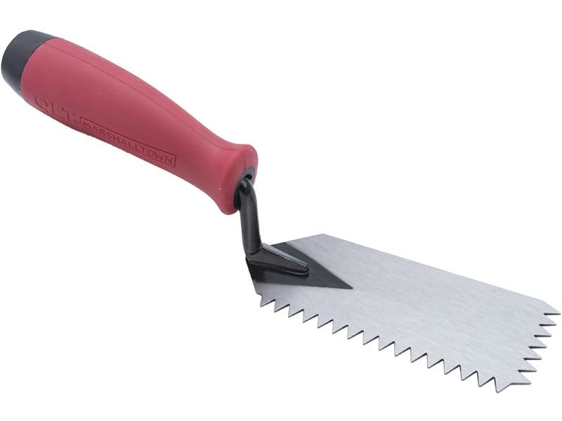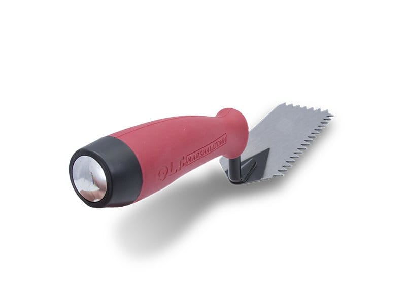 Marshalltown QLT zweiseitig gezahnte Randkelle: Ideal für Arbeiten in engen Räumen, robust und mit Softgrip Griff für lange Haltbarkeit. V-Zahnung: 6×6 mm. Maße: 127×51 mm.
