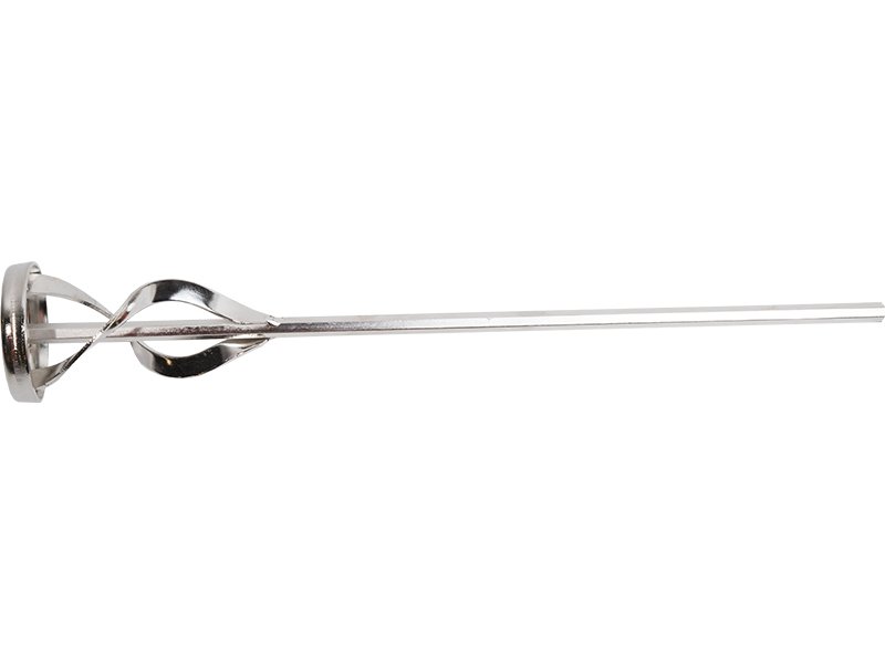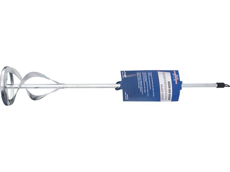 Hochwertiger Ribbon Mixer aus plattiertem Stahl für gleichmäßige Mischung von Trockenbaumaterial, Farbe, Kleber und Beschichtungen. Effizient bei 500-900 U/min. Passt auf ½“ oder größere Bohrmaschinen. Maße: 610×102 mm.