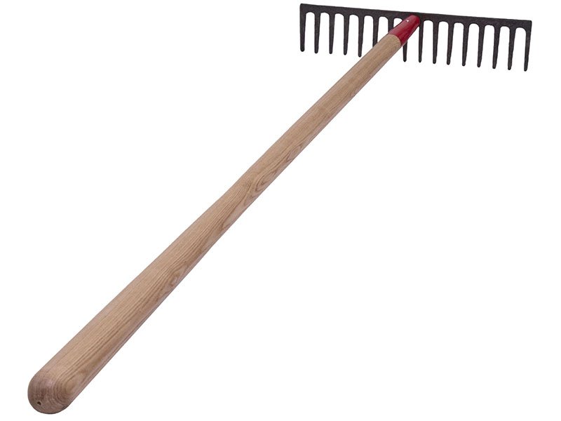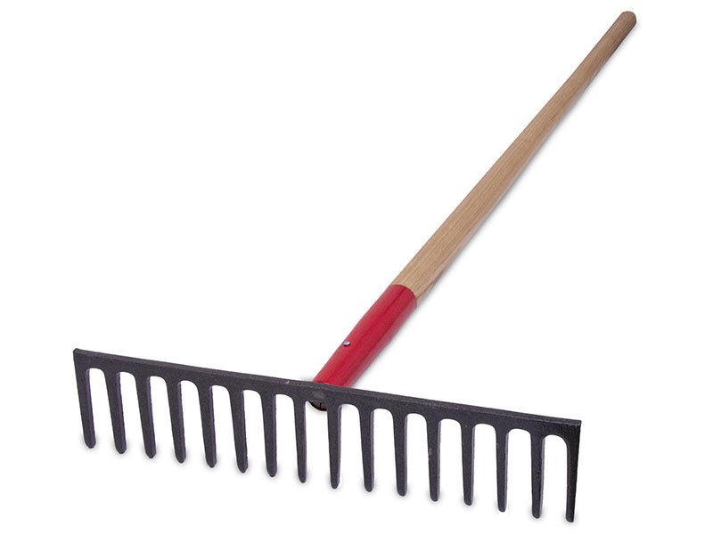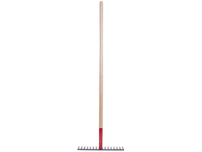 Marshalltown Straßenrechen: Einteiliger, geschmiedeter Stahlkopf, Eschenstiel mit roter Stahlzwinge, 16 Zähne (95 mm), Maße: 394×1524 mm.
