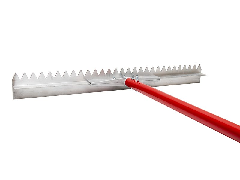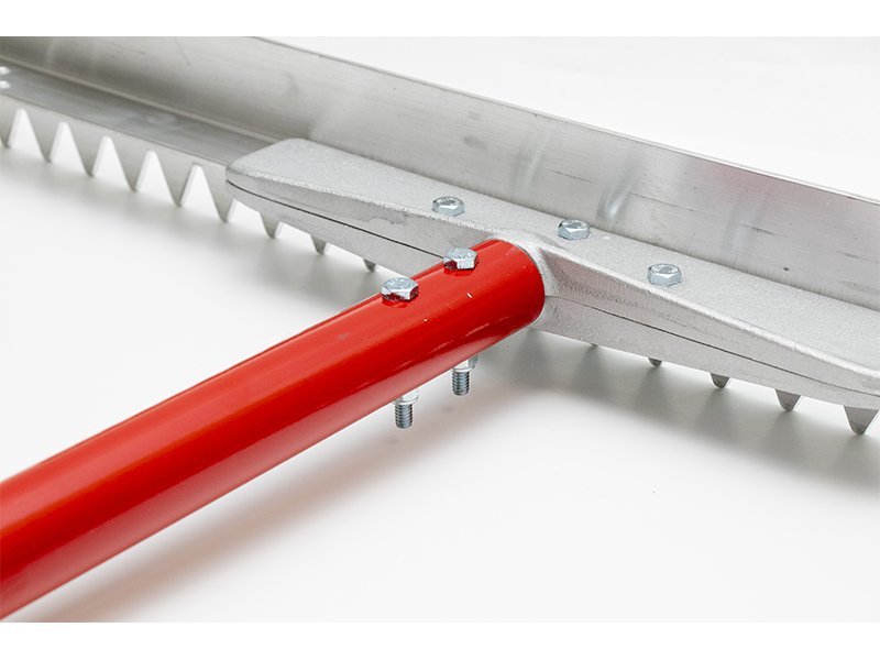 Marshalltown Betonverteiler aus langlebigem Magnesium mit scharfen Zähnen für ungehindertes Materialpassieren. Aluminiumstiel 2438 mm, T-Verbinder für Stabilität. Maße: 914×76 mm