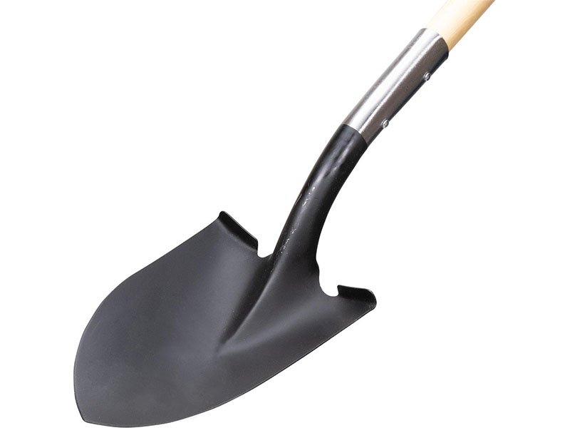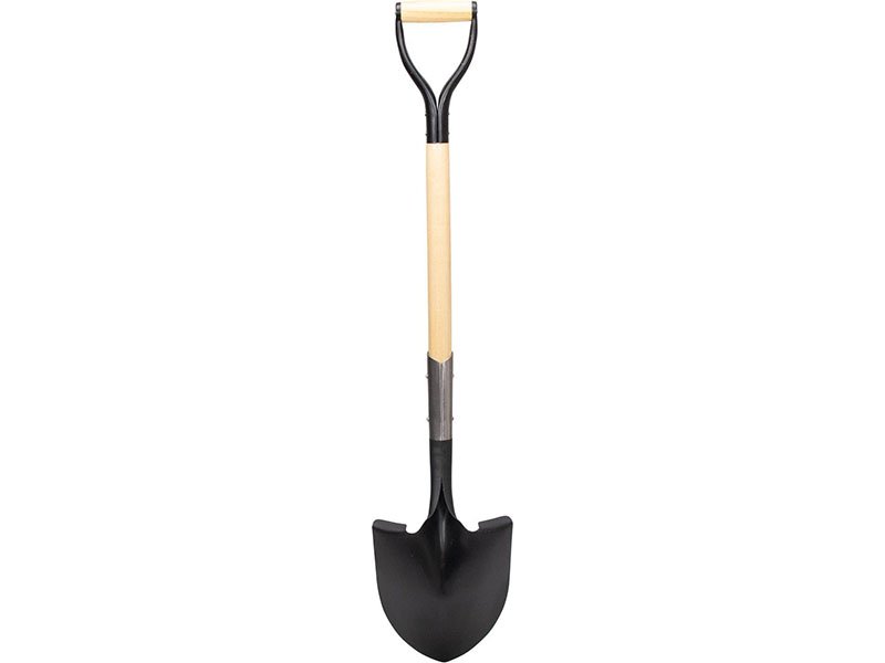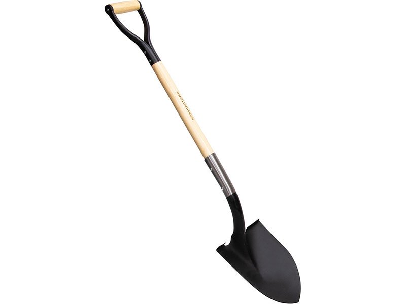 Marshalltown Schaufel mit abgerundetem, robustem Blatt aus gehärtetem Stahl der Stärke 14 mit Pulverbeschichtung. 787 mm langer Holzstiel mit D-Griff.