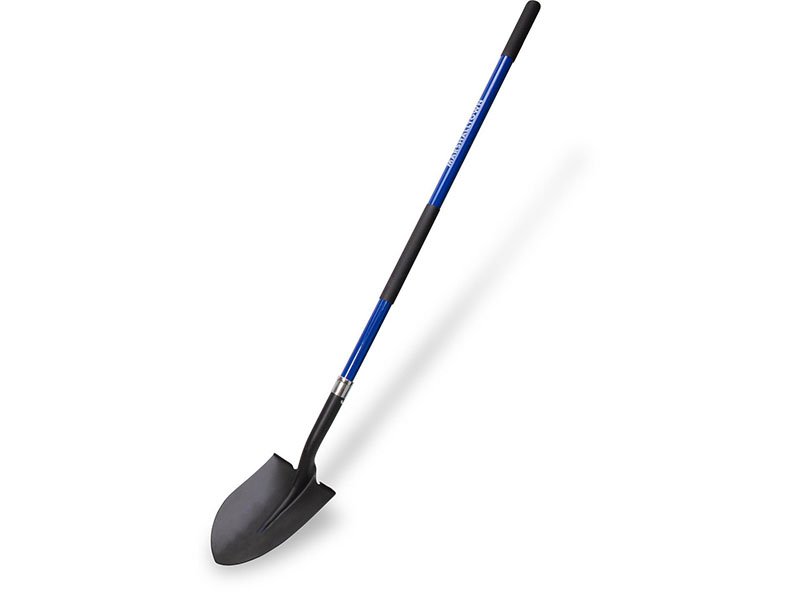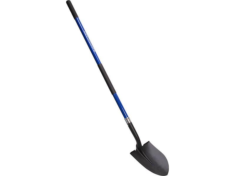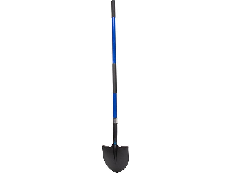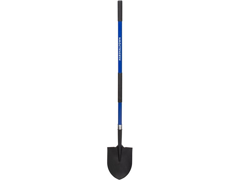 Marshalltown Schaufel mit abgerundetem, robustem Blatt aus gehärtetem Stahl der Stärke 14 mit Pulverbeschichtung. 1219 mm langer Fiberglas-Stiel.