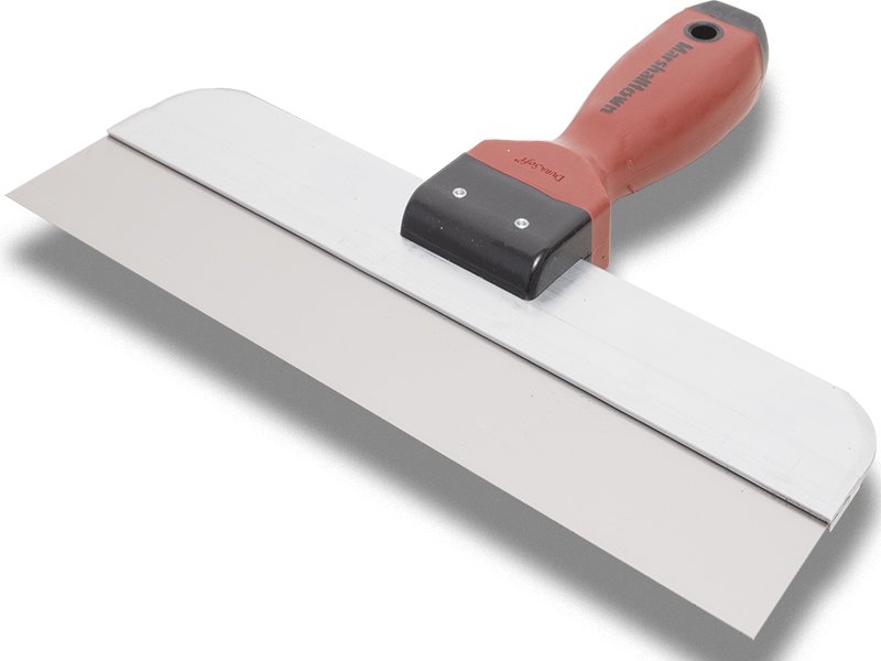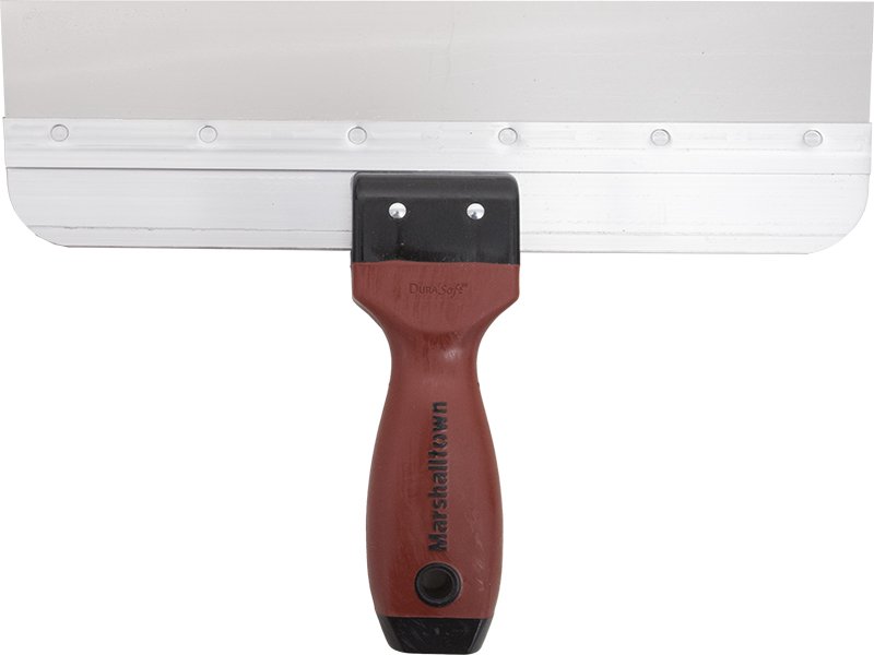 Der Flächenspachtel von Marshalltown hat ein hochwertiges, gehärtetes Blatt aus Edelstahl, dass mit einer Aluminium-Trägerplatte verbunden ist. Durch die Vernietung des Spachtels mit der Trägerplatte ist sichergestellt, dass der Griff sich auch nach starker Beanspruchung nicht löst. Der Flächenspachtel ist ein perfektes Mehrzweckwerkzeug, denn er kann zum Auftragen von Wandkitt benutzt werden, sowie auch zum Füllen von Trockenbaufugen und zum Abschaben von Oberflächen. Er hat ein konisches Blatt, das hervorragend für Eckarbeiten ist, außerdem erleichtert das schmale Blatt das Auftragen des Materials. Der widerstandsfähige Durasoft Griff bietet ein weiches Gefühl, verringert Ermüdung beim Arbeiten und ist sehr langlebig.