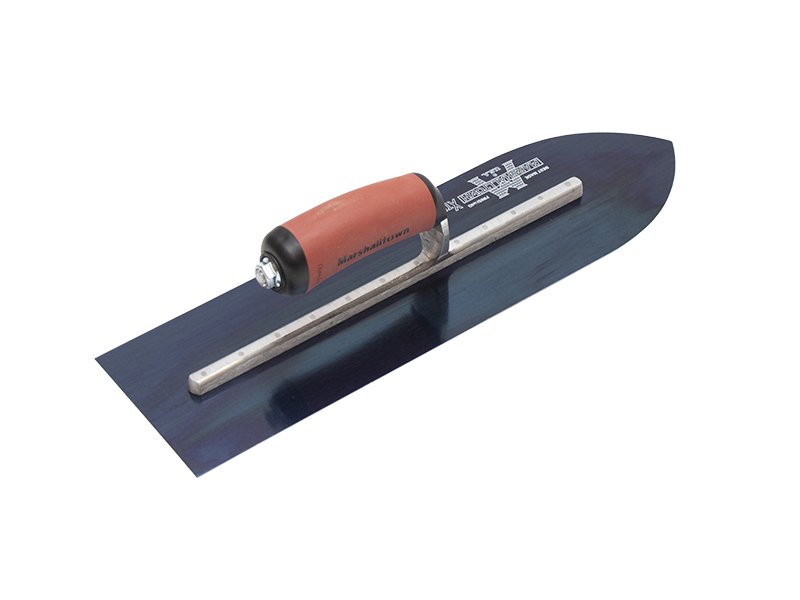 Marshalltown Spitzglättkelle aus hochwertigem Blaustahl, perfekt für schwer zugängliche Stellen, mit patentiertem Durasoft Griff. Maße: 406×114 mm.