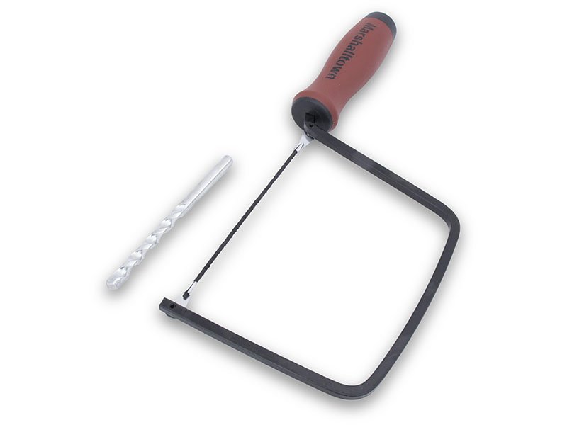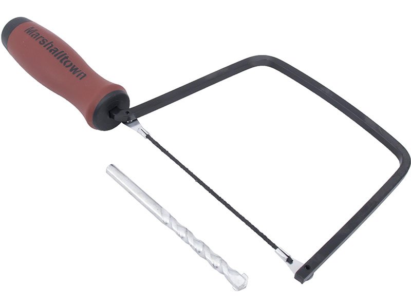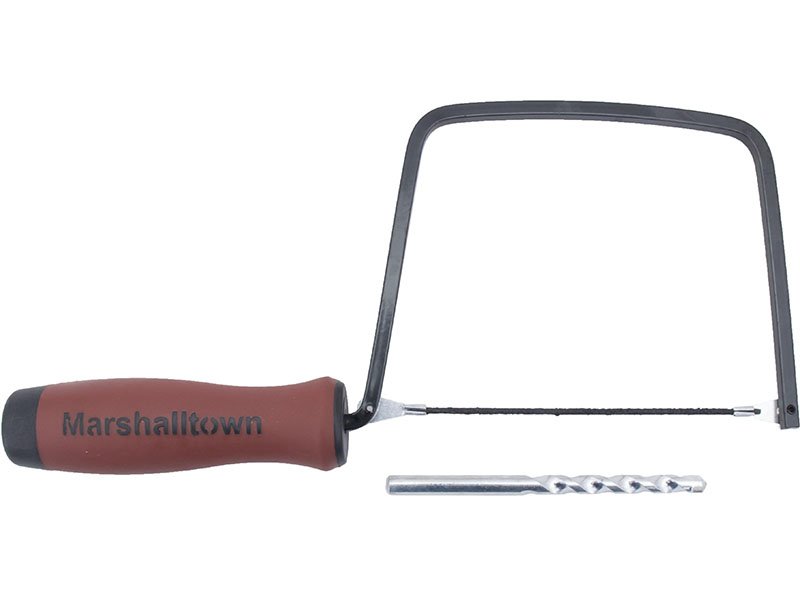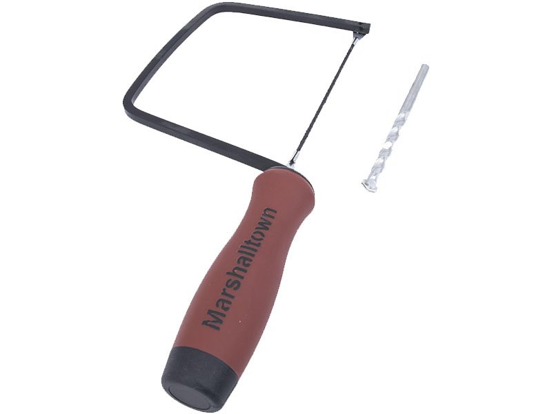 Die Marshalltown Stabsäge mit Bohrer schneidet unregelmäßige Formen in Fliesen. Verwenden Sie den Wolframkarbid-Bohrer, um ein Loch zu bohren, führen Sie den losen Schneidstab durch das Loch und befestigen Sie ihn wieder am Bügel, um mit dem Schneiden zu beginnen. Die Stabsäge wird mit einem widerstandsfähigen Durasoft Griff geliefert. Ersatzklingen sind verfügbar (28291).
