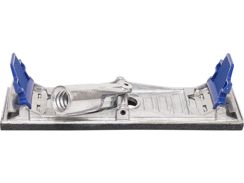 Der Marshalltown Stangenschleiferkopf: Flache, rutschfeste Schwenkhalterung für präzises Schleifen von Trockenbau-Fugen. Leichtes, verstärktes Aluminiumdruckguss mit Schnellwechsel-Verriegelungsklemmen. Maße: 239×82 mm.
