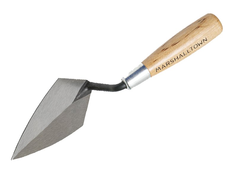 Marshalltown Archäologie-Spitzkelle: Aus einem Stück Carbonstahl, temperierte Klinge, Hartholzgriff, 114×57 mm. Ideal für kompaktes Sediment.