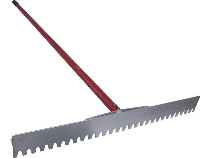 Marshalltown Betonverteiler aus langlebigem Magnesium mit stumpfen Zähnen für ungehindertes Materialpassieren. Aluminiumstiel 2134 mm, T-Verbinder für Stabilität. Maße: 813×76 mm