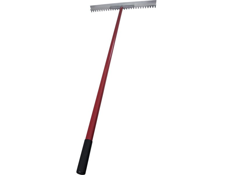 Marshalltown Betonverteiler aus langlebigem Magnesium mit stumpfen Zähnen für ungehindertes Materialpassieren. Aluminiumstiel 2438 mm, T-Verbinder für Stabilität. Maße: 914×76 mm