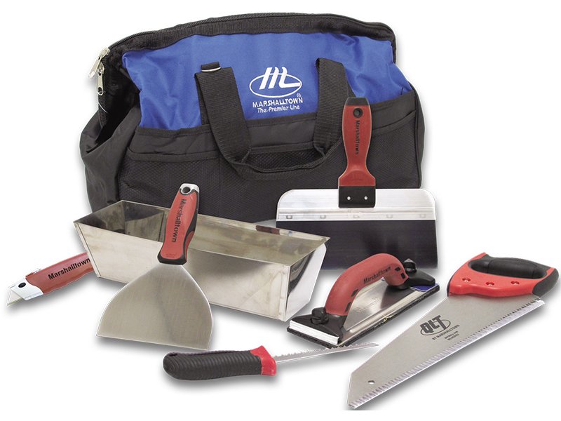 Das Werkzeugset von Marshalltown enthält alles, was ein angehender Trockenbauer bei der Arbeit benötigt. Im Set sind folgende Werkzeuge enthalten : # NB202 (16202) Nylon Werkzeugtasche. # 812 (16390) 305 mm Edelstahl-Maurerpfanne. # JK8860- 152 mm Fugenmesser. # 3510D (14338) 254 mm Blaustahl Flächenspachtel mit Durasoft Griff. # 20D (16320) Durasoft Handschleifer. # SGDS32-381 mm Trockenbausäge. # RW426 (16426) Rock Warrior® Allzwecksäge. # 9070-Einstellbares Universalmesser. Bewahren Sie oder tragen Sie alle Ihre hochwertigen Marshalltown-Werkzeuge in einer Werkzeugtasche aus Nylon, dann ist auch immer alles griffbereit und geht nicht verloren.