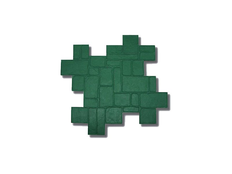 Marshalltown Betonstempel „Verona Cobblestone“: Harte Kunststoffkonstruktion, erzeugt Kopfsteinpflastermuster, 6 mm tiefe Fugenlinien, grün und flexibel. Maße: 1143×1143 mm.