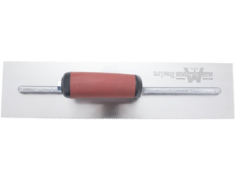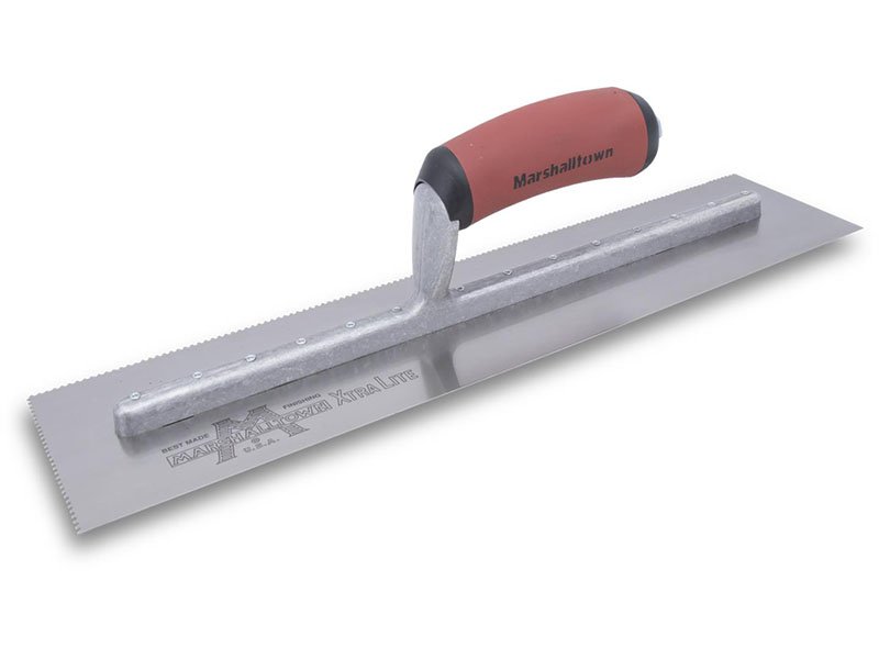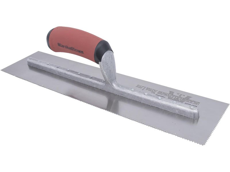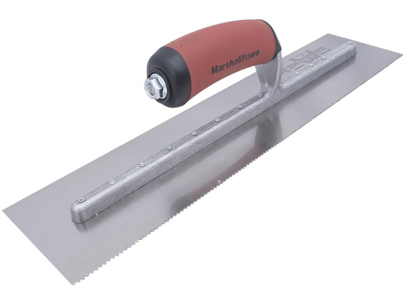 Die zweiseitig gezahnte Kelle von Marshalltown für präzises Auftragen von Klebstoffen und Fliesenkleber. Robustes Design mit Durasoft Griff für Komfort. Blattgröße: 279×114 mm, U-Zahnung 1,5×1,5×1,5 mm.