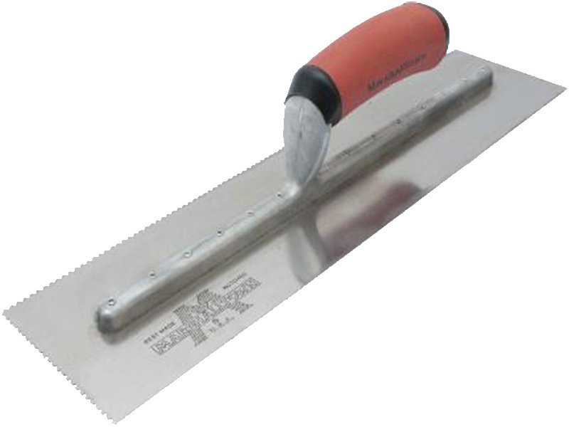 Die zweiseitig gezahnte Kelle von Marshalltown für präzises Auftragen von Klebstoffen und Fliesenkleber. Robustes Design mit Durasoft Griff für Komfort. Blattgröße: 279×114 mm, U-Zahnung 1,5×1,5×2,5 mm.
