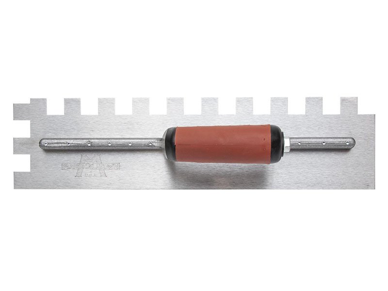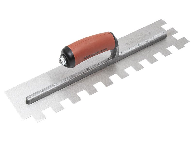 Zweiseitige Zahnkelle von Marshalltown für alle Fliesenarbeiten aus Edelstahl. Eckig gezahnte Kelle, 19x19x19mm, mit Durasoft Griff. Maße: 406×101 mm.