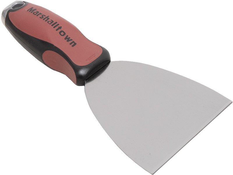 Marshalltown Fugenspachtel aus Edelstahl. Ideal zum Spachteln, Abschaben, Tapeten entfernen und für Wand-, Kitt- und Lackierarbeiten. Flexibel, langlebig und mit patentiertem Durasoft Griff. Inklusive Aufhängeloch und Hammerkopf. Maße: 229×127 mm.