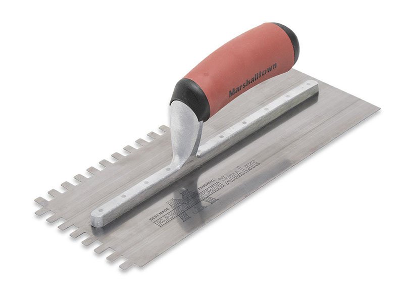 Zweiseitige Zahnkelle von Marshalltown für alle Fliesenarbeiten aus Edelstahl. Eckig gezahnte Kelle, 6 mm, mit Durasoft Griff. Maße: 279×114 mm.